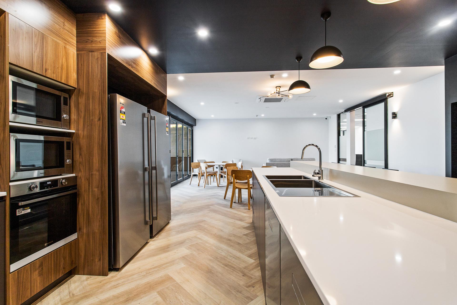 The timber and black kitchen with staff breakout area welcomes staff to take a break from their day.